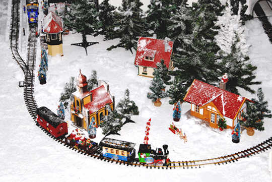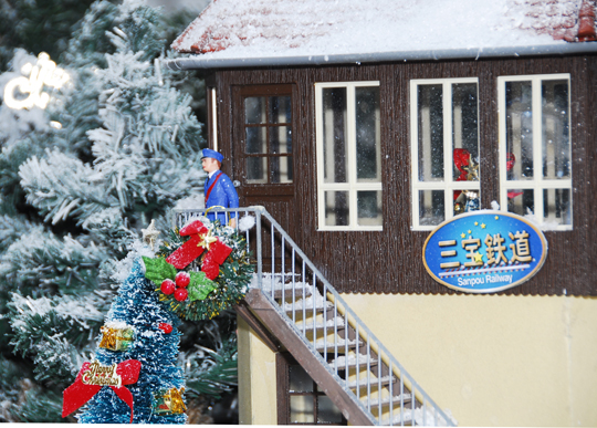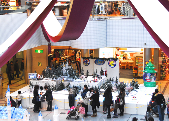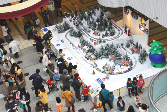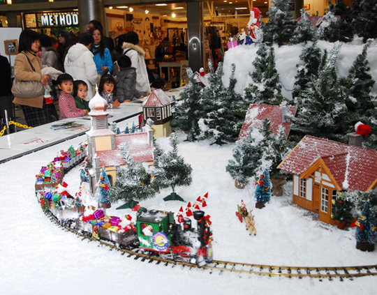 アステ川西店舗振興会の依頼で、クリスマスイベントに参加しました。200本の針葉樹と大量のスノーパウダーでもって、雪景色のジオラマを造りました。サンタクロースが運転するGゲージ小型車両を走らせ、大好評でした。